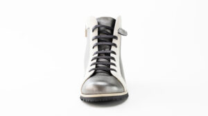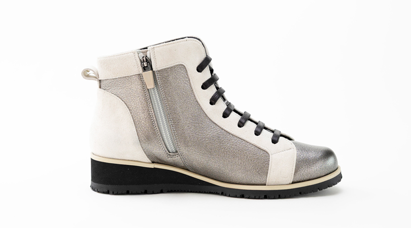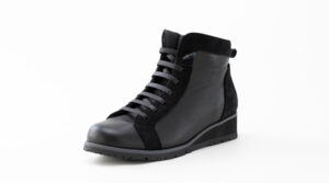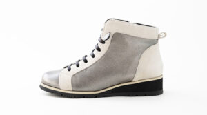 スムースレザーとスエードの異素材コンビショートブーツ。ゴムレース&サイドファスナーで着脱が楽ちん♪コンビ素材がおしゃれでパンツにもスカートにも合わせやすいです。
